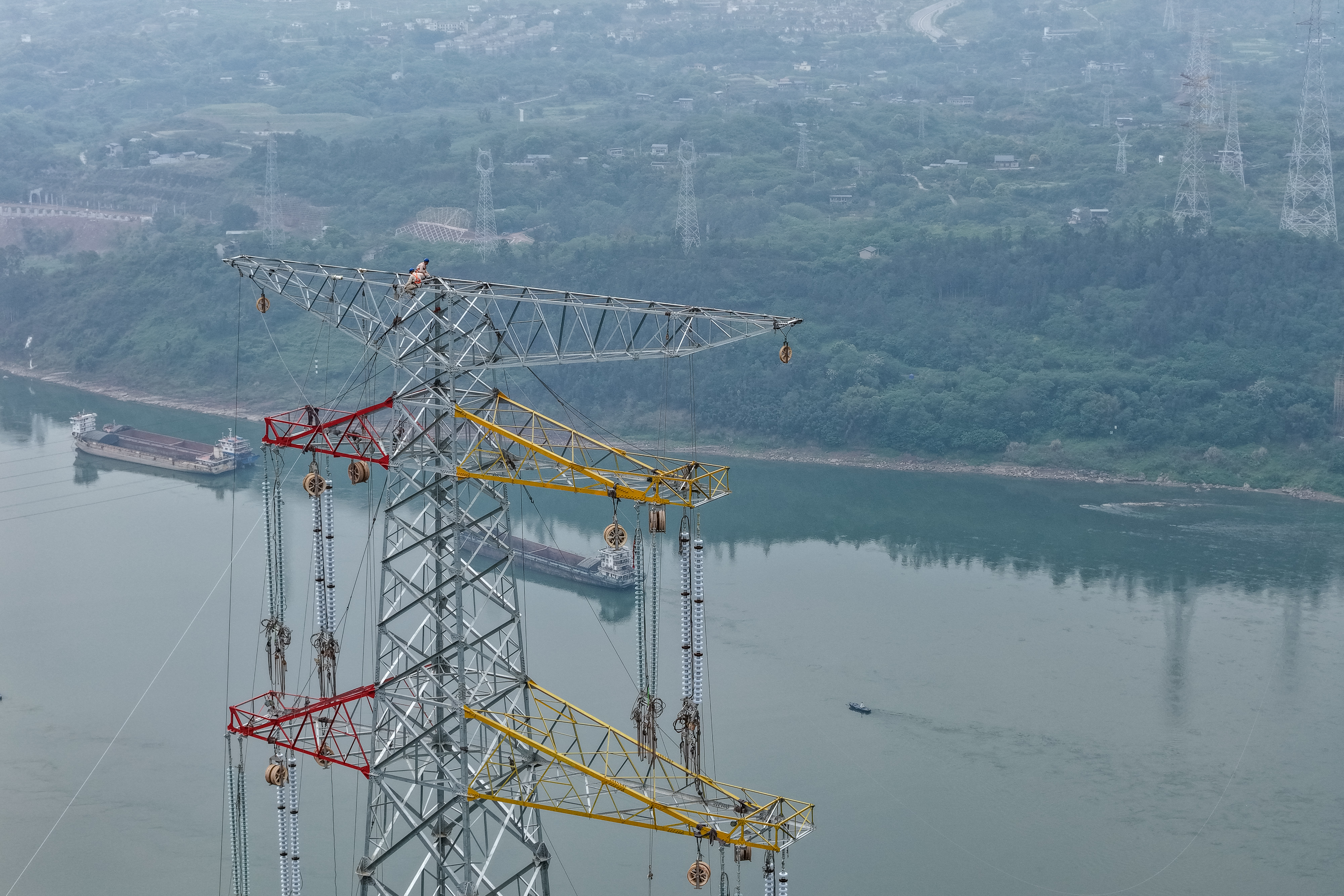 4月11日,在重庆市江津区珞璜镇的新玉500千伏输变电工程(线路部分)跨长江放线作业现场,工作人员进行准备工作。新华社记者 黄伟 摄
