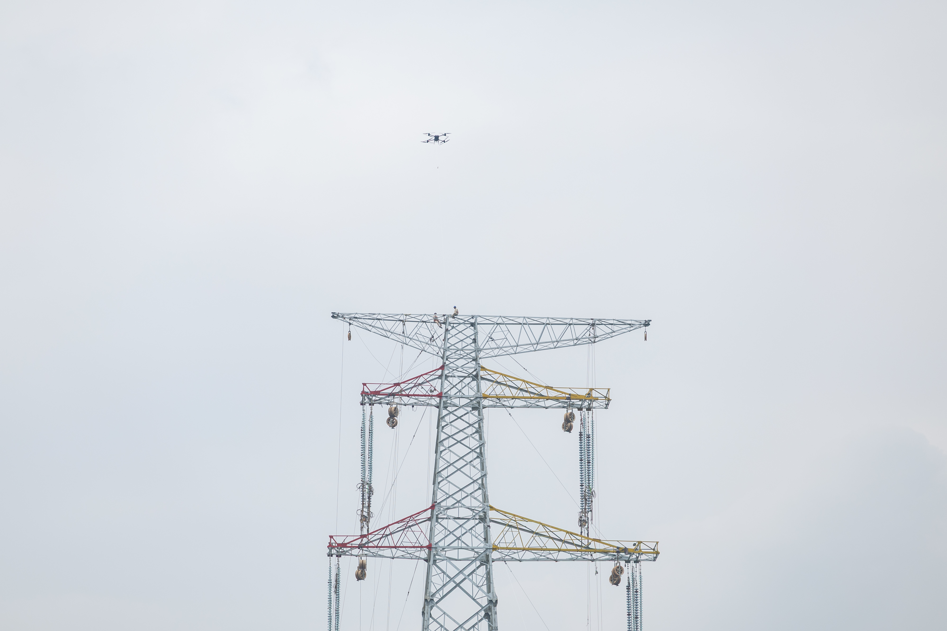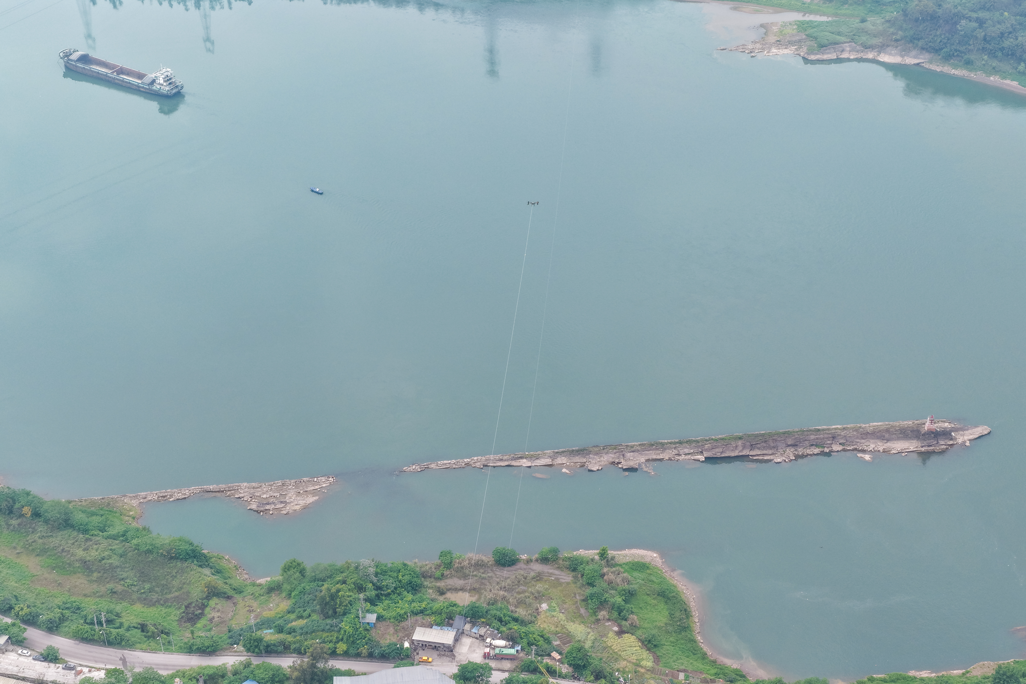 4月11日,在重庆市江津区珞璜镇的新玉500千伏输变电工程(线路部分)跨长江放线作业现场,大载重无人机搭载四段投掷器进行跨长江放线作业(无人机照片)。新华社记者 黄伟 摄