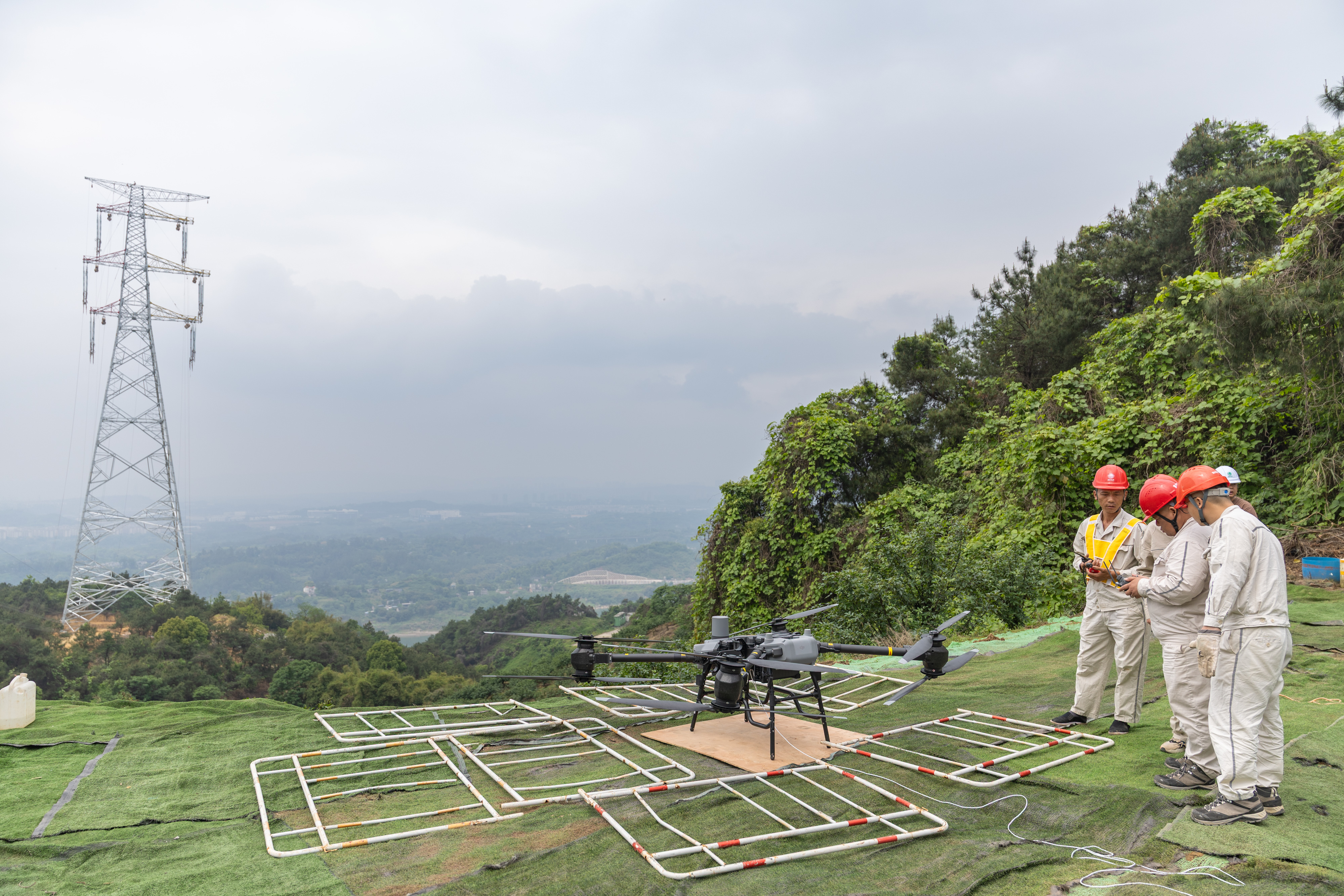 4月11日下午,在位于重庆市江津区珞璜镇的新玉500千伏输变电工程(线路部分)跨长江放线作业现场,国网重庆电力的工作人员使用大载重无人机搭载四段投掷器,牵拉导引绳顺利跨越长江。 以往,无人机跨江放线需要高空作业人员手动解绑导引绳。而此次大载重无人机搭载四段投掷器飞抵塔基上空后,只需数十秒就可完成自动抛投导引绳,提升了作业安全性和效率。