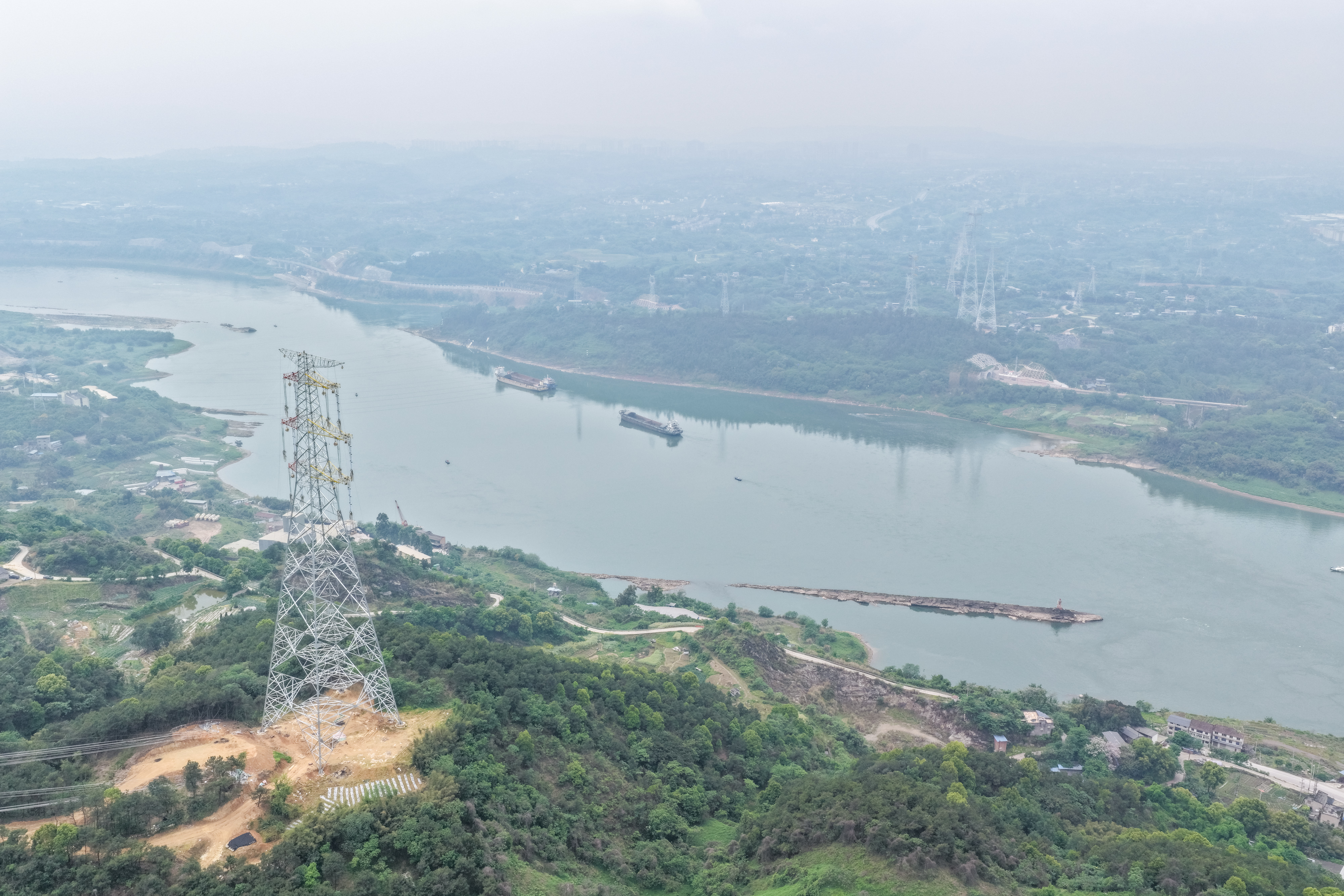 这是4月11日在重庆市江津区珞璜镇拍摄的新玉500千伏输变电工程(线路部分)跨长江放线作业现场(无人机照片)。新华社记者 黄伟 摄