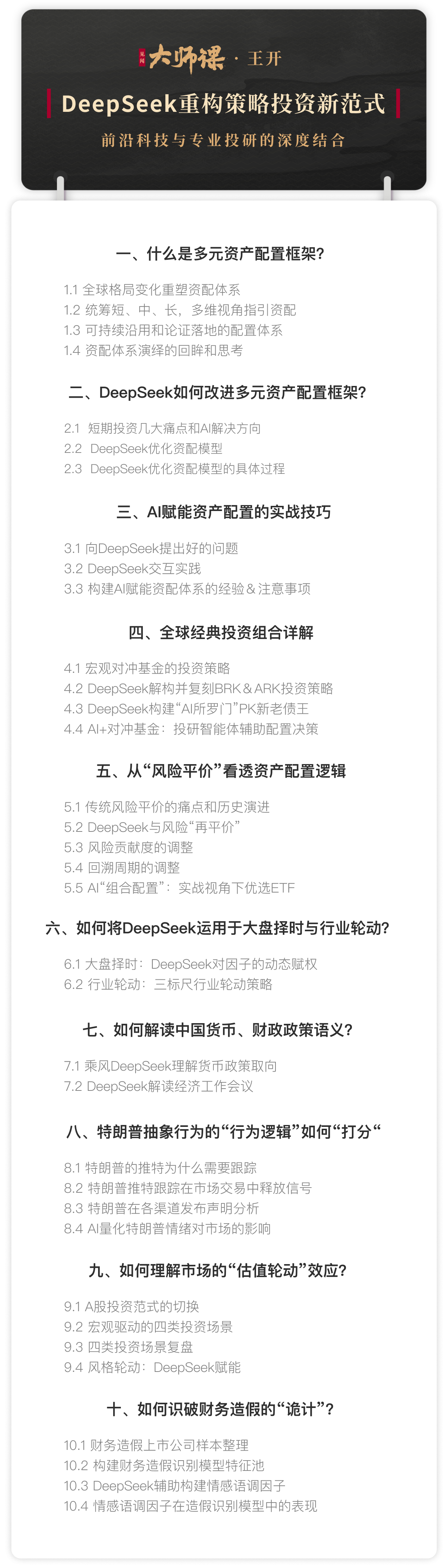 本节课程,国信证券首席策略师王开将拆解这些“隐性坑”,并展示如何借助DeepSeek的大模型能力,在不改变大方向的前提下,把组合做再优化——哪怕只是1%的提升,都可能意味着在关键时点上,你比市场多数人多出一份稳健和胜率。